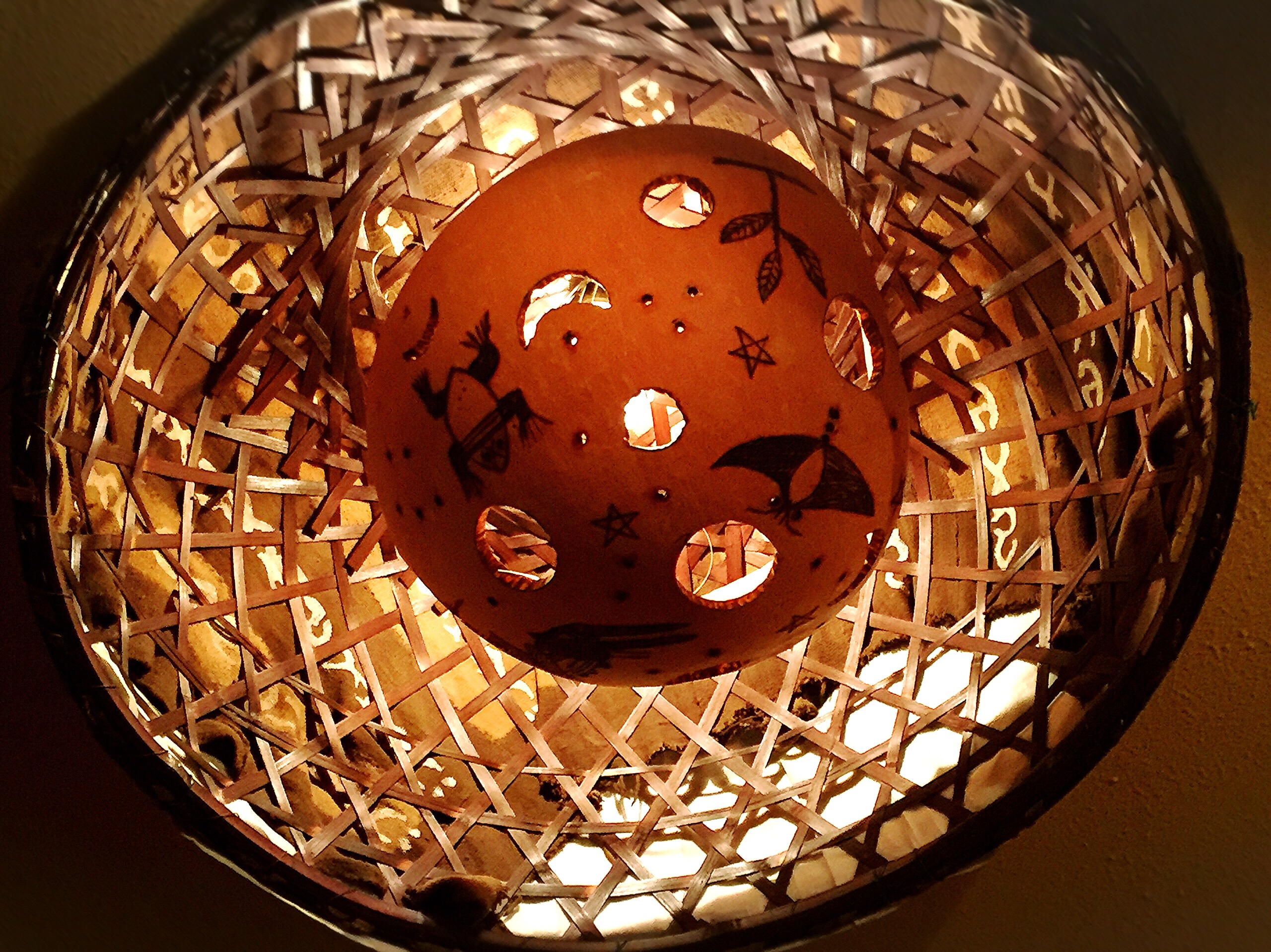 アフリ子による一時間のライブが終わり、これでおしまいかなと思ったら、ここからが凄かった。何やら不思議な楽器が登場。これはコラという西アフリカの民族楽器だそうで、とても美しい音がします。調べてみると、コラのボディーはひょうたんでできているそうで、それってもしかして先ほど写真に挙げた店内の電気装飾と同じ材料では?!