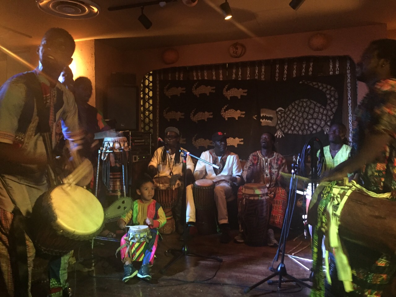 二人の男性がコラを奏でるうちに打楽器を持った黒人男性達が次々とやってきて、あっという間にステージを埋め尽くしました。小さな男の子まで一生懸命太鼓を叩いています。10人以上の男性達が一心不乱に叩く太鼓の音は耳を塞いでいないと痛くなりそう。身体の中から湧き上がるようなエネルギッシュなリズム感はとにかく凄いです。