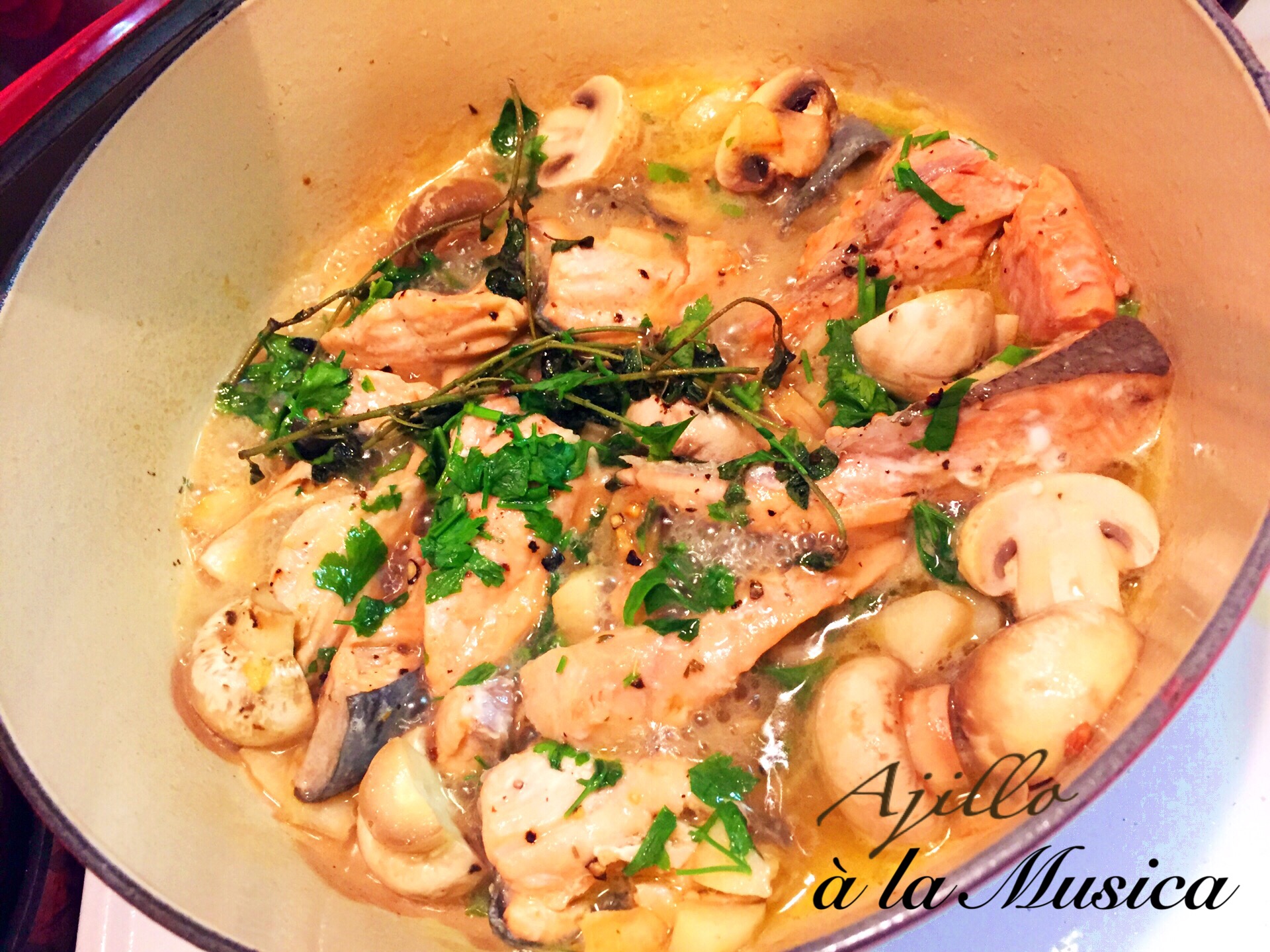 作り方はうる覚えだけど、小鍋にオリーブオイルと赤唐辛子、ニンニクを加え、香りが出たところでニンニク、赤唐辛子を取り出します。食べやすい大きさに切った鮭を皮から焼いて、マッシュルーム、白ワイン少々を加えたら塩胡椒で味付け。ニンニクと冷蔵庫にあったタイムやイタリアンパセリも加えて軽く煮たら完成です。残ったソースはバゲットに付けてもとても美味しいですよ。