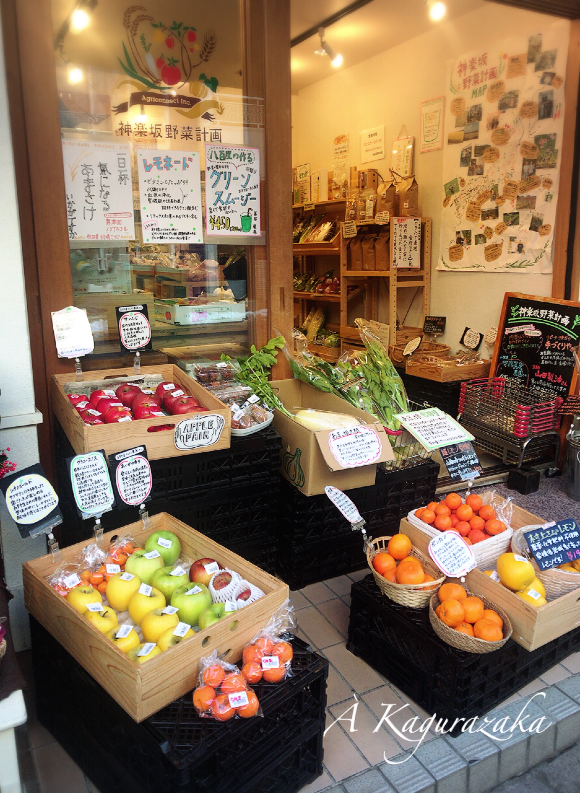 イタリア食材店、赤城神社、セレクトショップと周り、最後に寄ったのはMお姉様がよく寄るという野菜屋さん「神楽坂野菜計画」へ。ここは農家から直接仕入れた新鮮で、ちょっと珍しい野菜や果物が色々と揃っていました。
