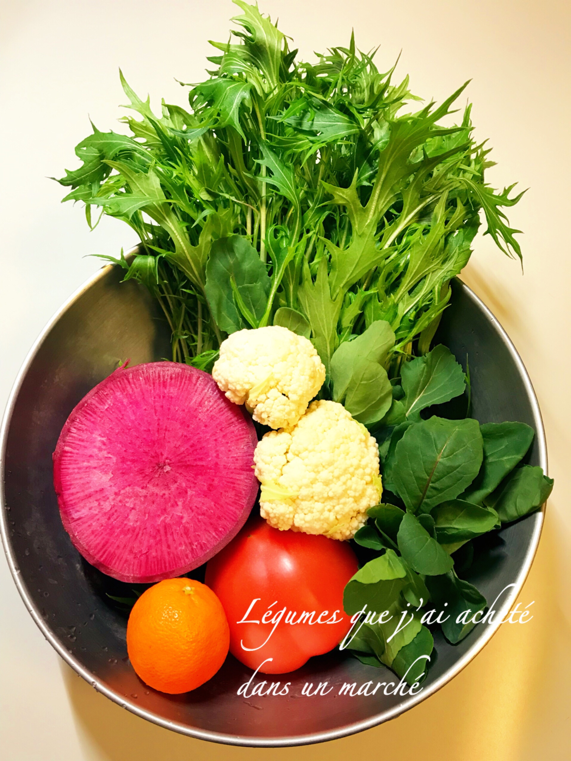 この日、購入した野菜。水菜、ルッコラ、一口サイズのカリフラワー、紅大根、トマト、そして、手前の金柑のように見える柑橘類はなんとレモンです。