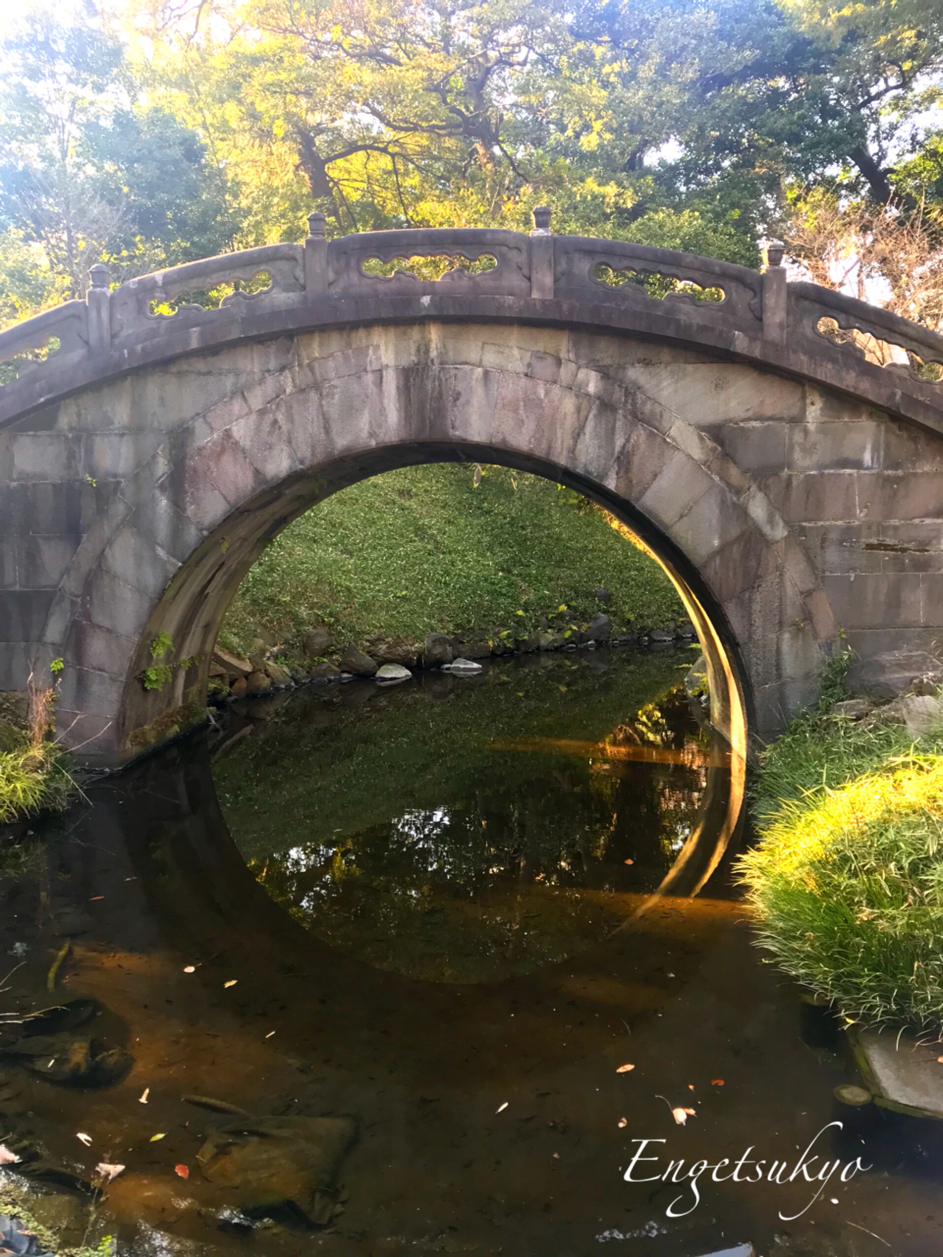 梅林を抜けて少し歩くと円月橋という美しい形の橋がありました。水面に橋が映ると満月のように見えることからこのように名付けられたそうです。